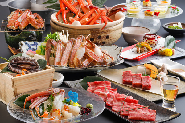 朝夕お部屋食【人気NO1☆冬爛漫プラン】活花咲くカニ刺し+カニ&但馬牛のW鍋+焼きカニ+茹カニ+活鮑+但馬牛ステ-キ