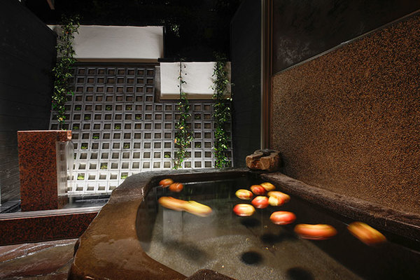 【天然石姿風呂(りんご風呂)、畳敷きの自然石切出し風呂(オレンジ・ライム風呂)、信楽焼き陶器風呂(花風呂)】のいずれか一つが無料でご利用頂けます。